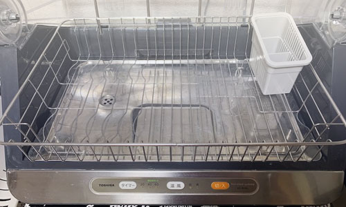 食器乾燥機に洗った食器を入れると、下のトレイに水が落ちる構造ですが、トレイに水滴の跡が付き、放置するとアルカリ性の水垢は、乾くと白く固まります。